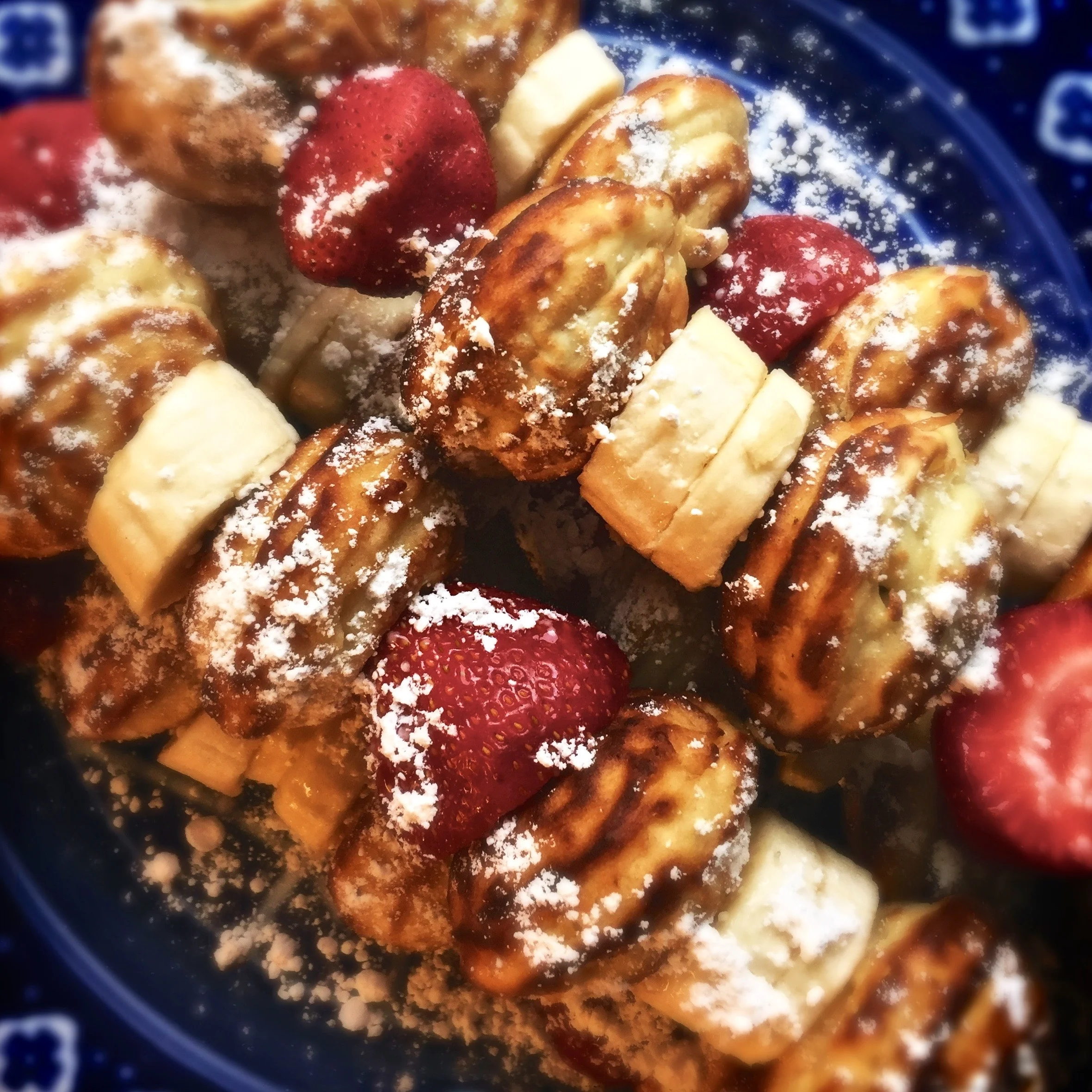 SKEWERED CHOCOLATE FILLED PANCAKE BALLS WITH STRAWBERRIES & BANANAS
